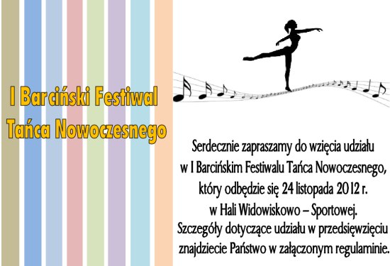 Miejski Dom Kultury w Barcinie oraz Studio Kreacji Tańca w Bydgoszczy zapraszają do wzięcia udziału w I Barcińskim Festiwalu Tańca Nowoczesnego, który odbędzie się 24 listopada 2012 r. w Hali Widowiskowo-Sportowej w Barcinie.
