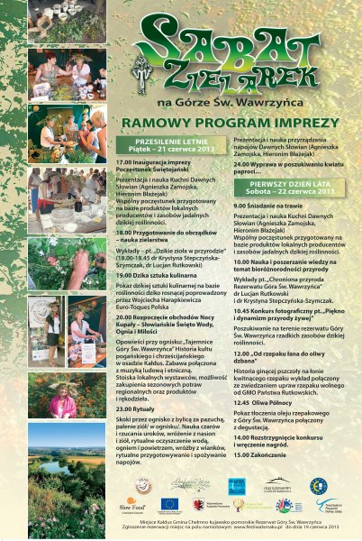 Slow Food Convivium Gruczno zaprasza na "Sabat Zielarek na Górze Św. Wawrzyńca", który odbędzie się w dn. 21-22.06.2013 w miejscowości Kałdus, na Górze Św. Wawrzyńca. Znajdujący się tu rezerwat przyrody i grodzisko wczesnośredniowieczne ze śladami osadnictwa z VIII wieku będzie scenerią imprezy z okazji letniego przesilenia.